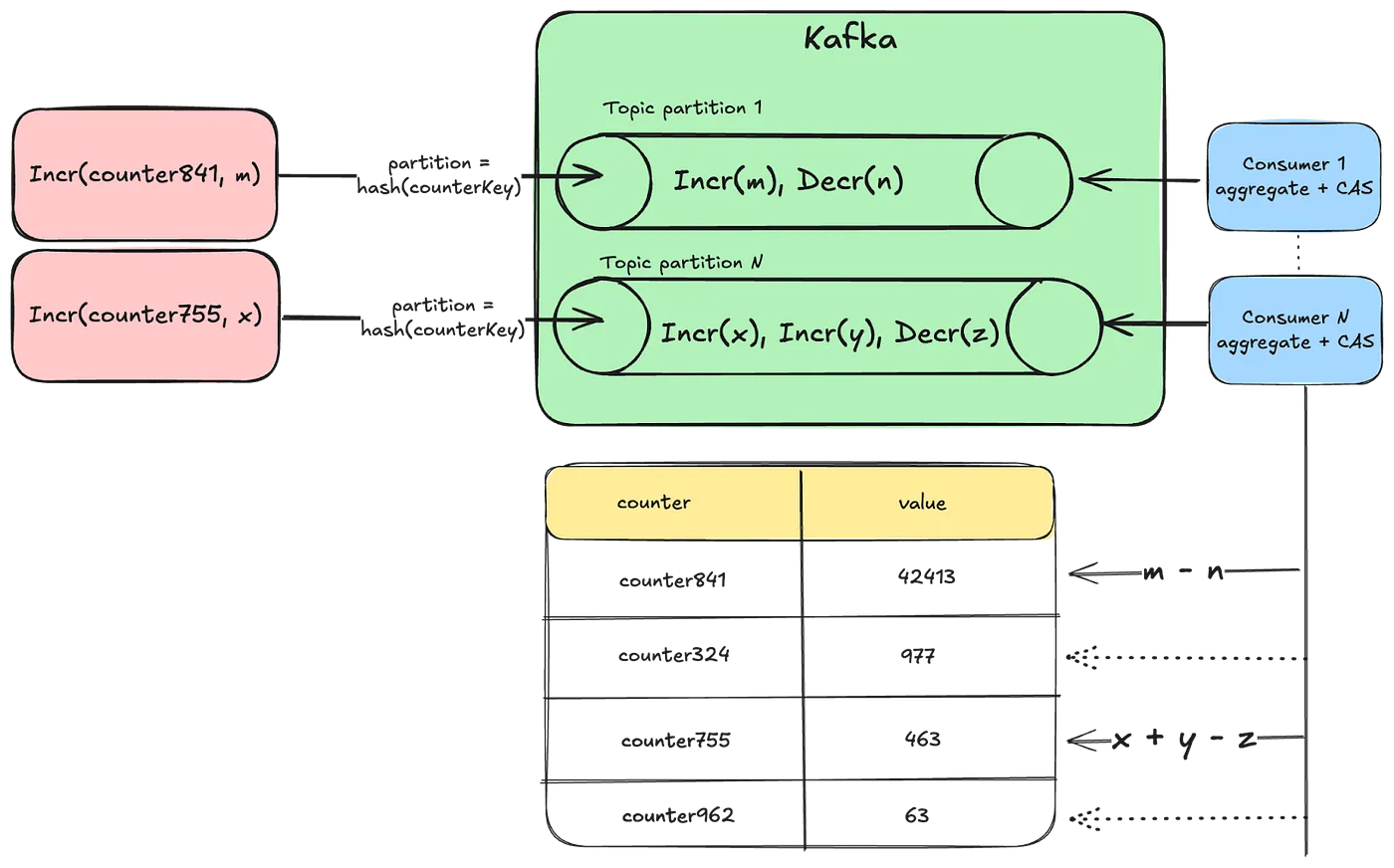 - 여러 개의 토픽 파티션을 만들고 카운터 키를 특정 파티션에 해싱하여, 동일한 카운터가 동일한 컨슈머에 의해 처리