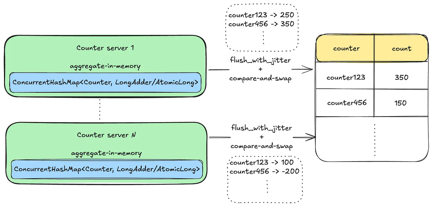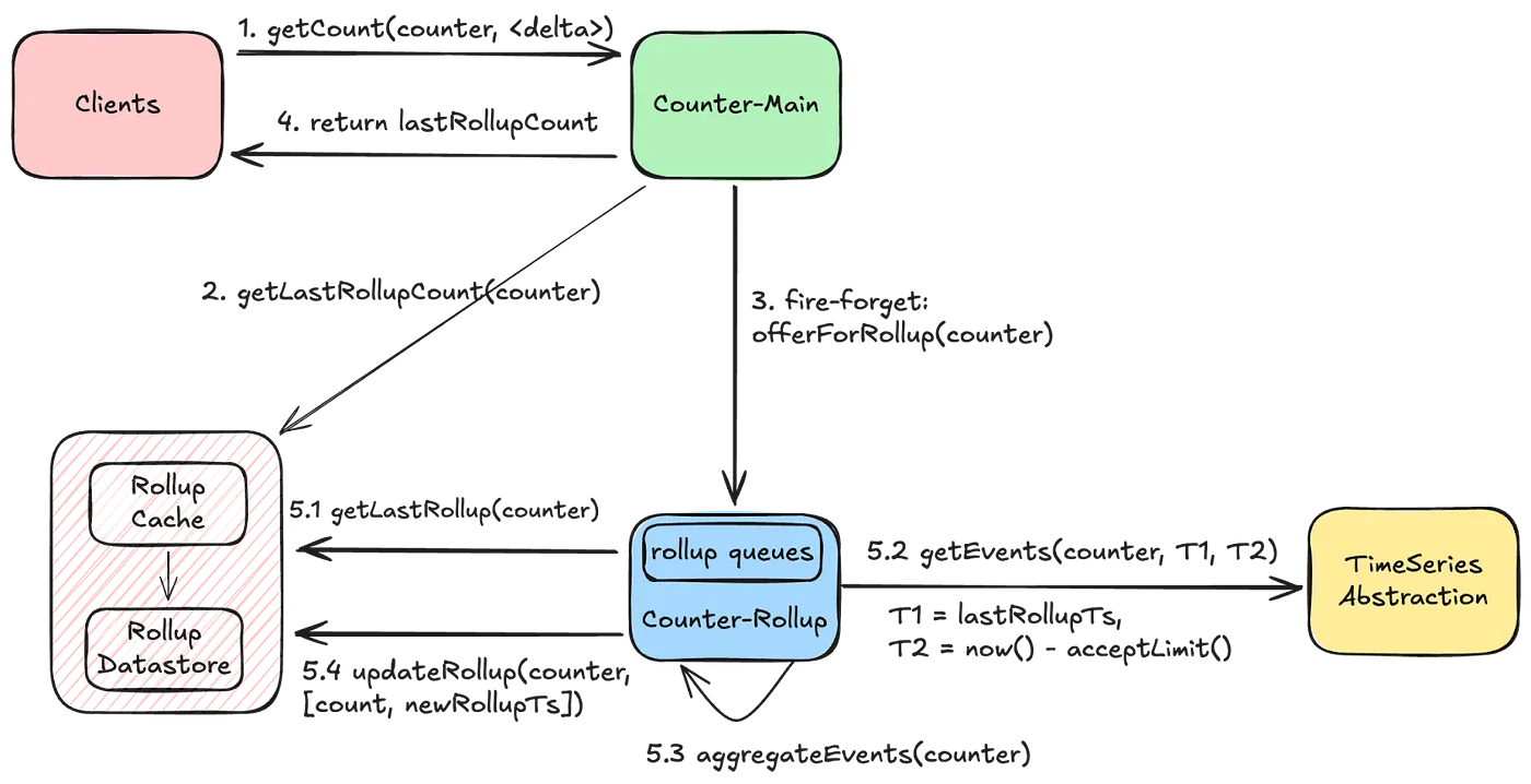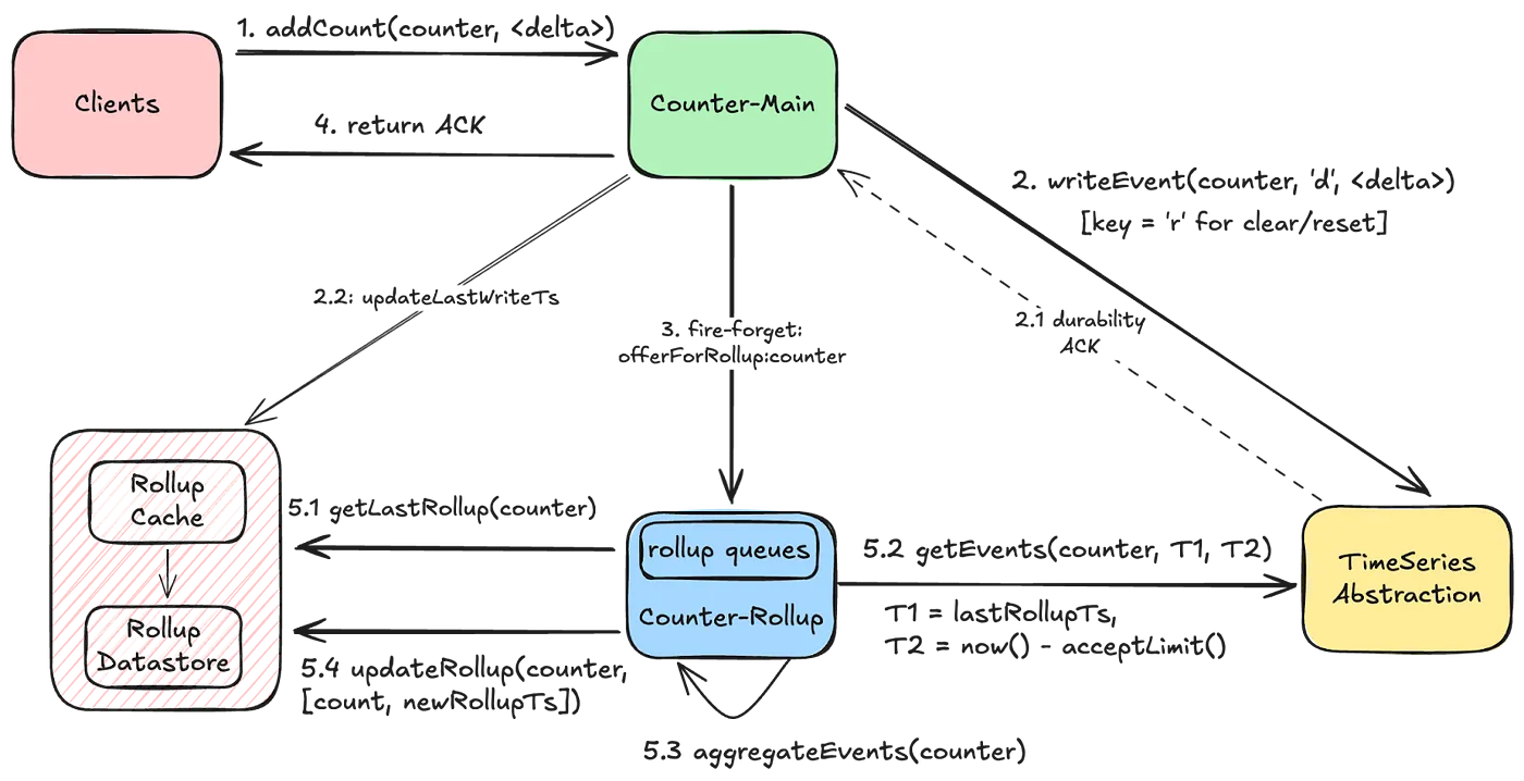 - 카운터에 무슨 요청이든 발생하면 롤업 이벤트를 보냄. 이벤트는 인메모리 큐에 쌓이고 중복을 최대한 제거(주어진 기간 동안 한 번만 aggregate를 실행)