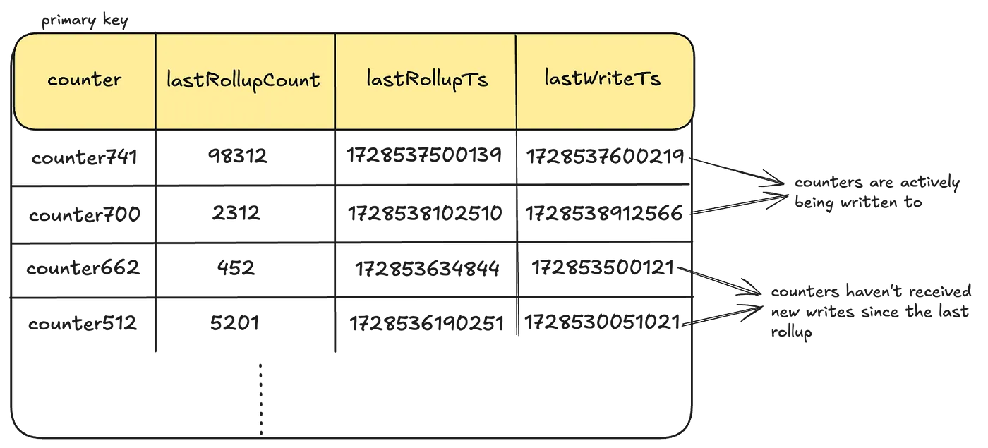 - increment event를 기록할 때 LastWriteTs도 갱신해서, 이 값이랑 lastRollupTs를 비교해서 aggregate를 수행한다고 합니다
