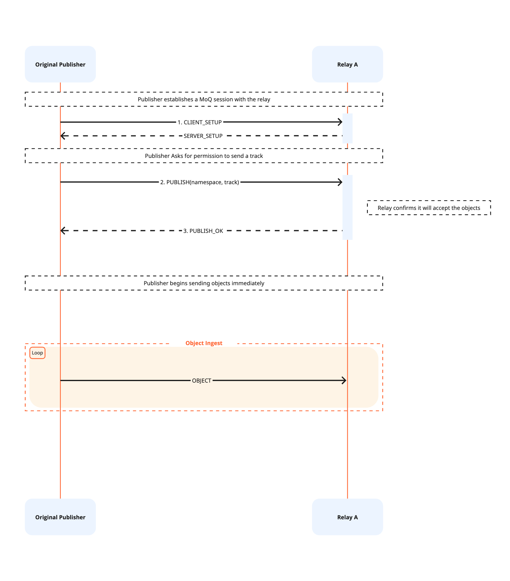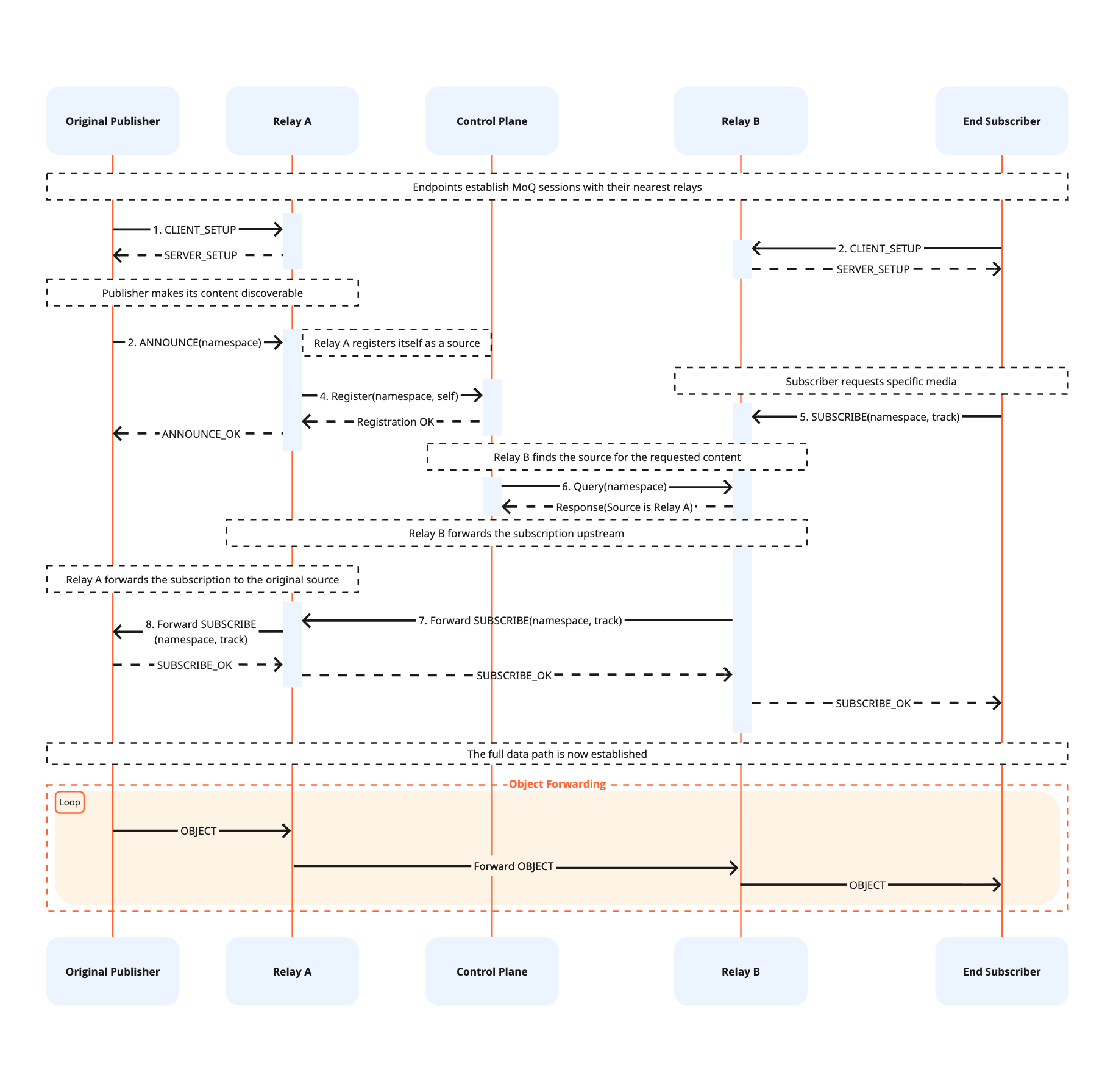 - MoQT Layer: pub/sub 구조를 정의하는 계층. ANNOUNCE, SUBSCRIBE 등등 컨트롤메세지