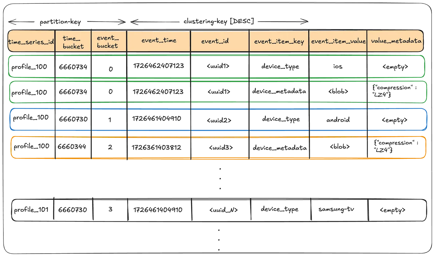 - time series id, time bucket, event bucket을 파티션 키로 설정하여 hot partition 예방