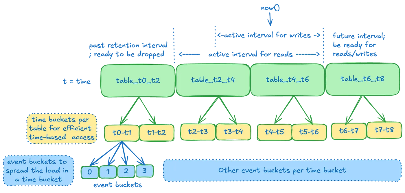 - 데이터 보존 단위로, 카산드라 테이블에 매핑됨. 이벤트는 event time에 따라 테이블에 저장됨.