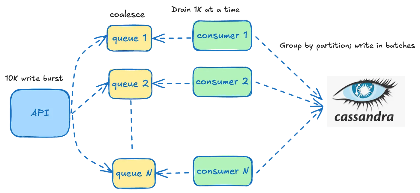 - 워크로드 관리용. 갑자기 너무 요청이 와바박 들어오면 파티션 키별로 인메모리 큐에 넣고 일정 시간에 걸쳐 분산해주자