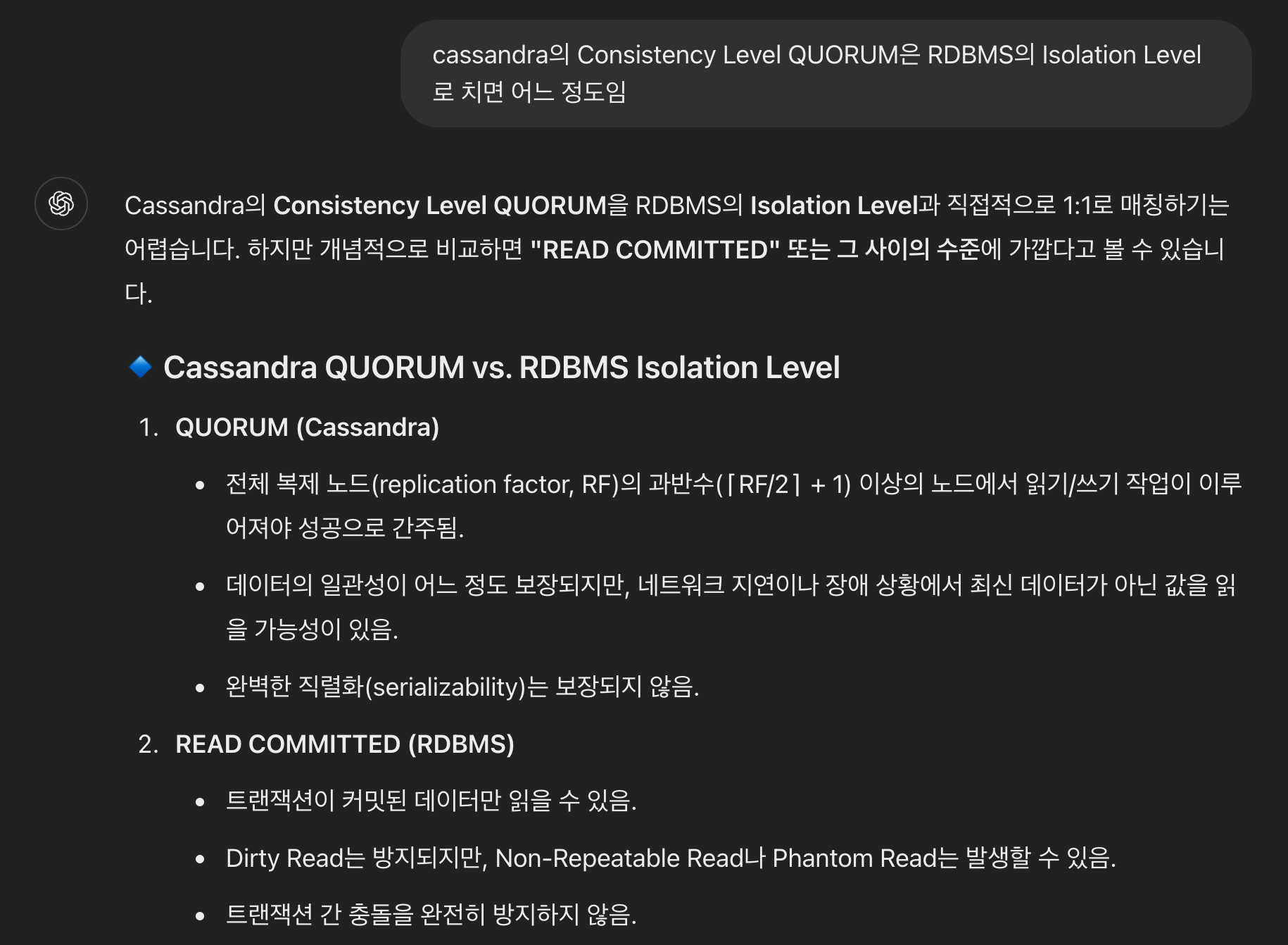 사실 저도 이게 뭔지 잘 몰라서 GPT한테 물어봤습니다. 분산 DB이니 완전히 매칭시키긴 어렵지만, 얼추 READ COMMITTED 수준이라고 하네용